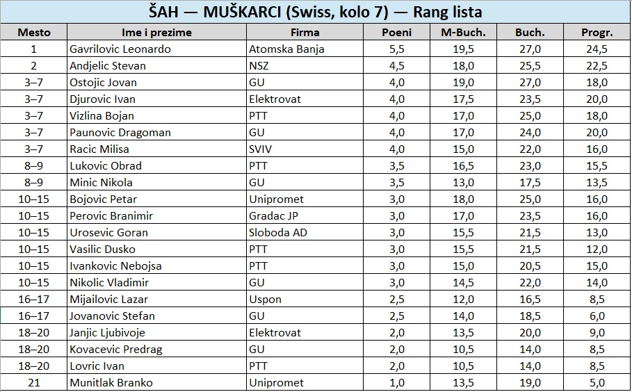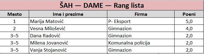Posle uzbudljive završnice u ženskom šahovskom turniru, tri takmičarke (Dana Radović, Vanja Stojanović i Milena Jovanović) završile su osnovni deo sa istim brojem poena, pri čemu je svaka — belim figurama — savladala svoju rivalku. O konačnom poretku odlučilo je doigravanje: Dana Radović je pobedila obe protivnice i zasluženo osvojila treće mesto, dok je u meču za četvrto mesto Vanja Stojanović bila bolja od Milene Jovanović.